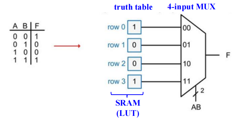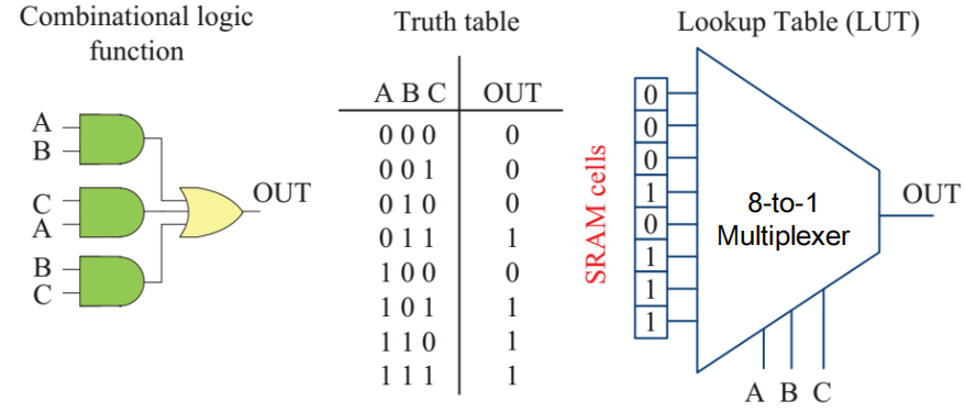 • 内存 ( 通常是静态随机存储器 (static random-acess memory, SRAM)) 能够实现组合逻辑。在 FPGA 中,这样的内存被称为查找表 (lookup tables, LUTs)