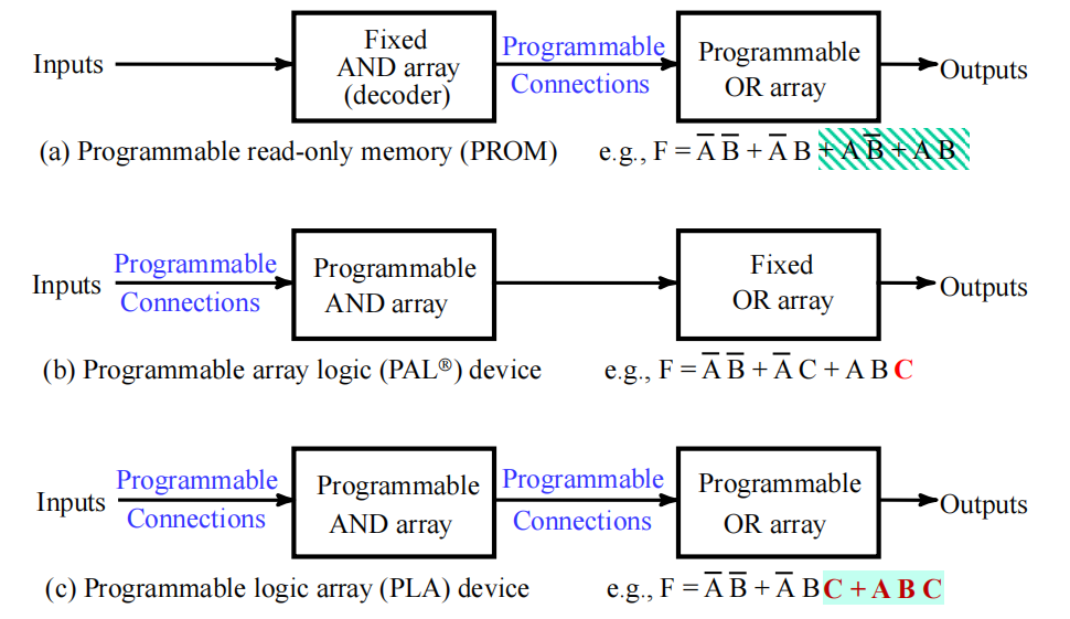 • 通过带有 \(M\) 个输出的可编程 (programmable) 或门阵列,构成 \(M\) 个最小项之和的表达式
