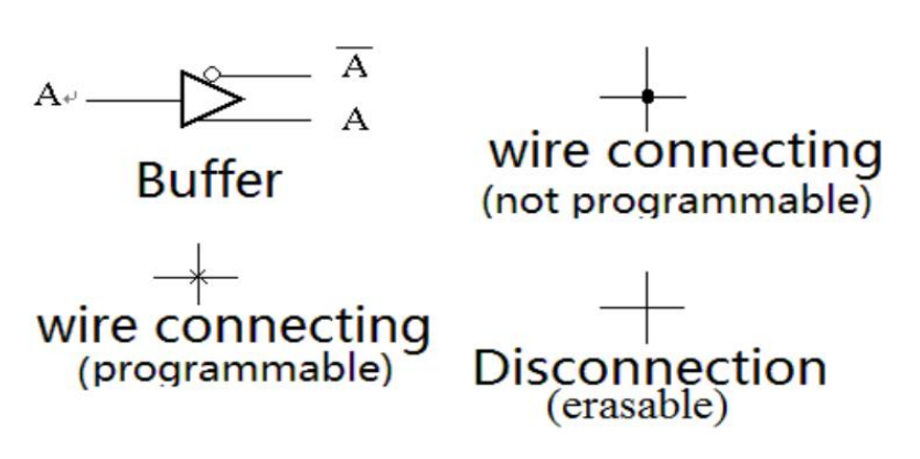可以看到与门的输出线路和或门的输入线路之间的交点并不是用 \(\times\),而是用 \(\cdot\) 表示的,说明或门阵列是固定的,即对应布尔方程的乘积项数量是固定的。再加上每个乘积项的字面量个数可以改变,因此它的输出本质上是SOP