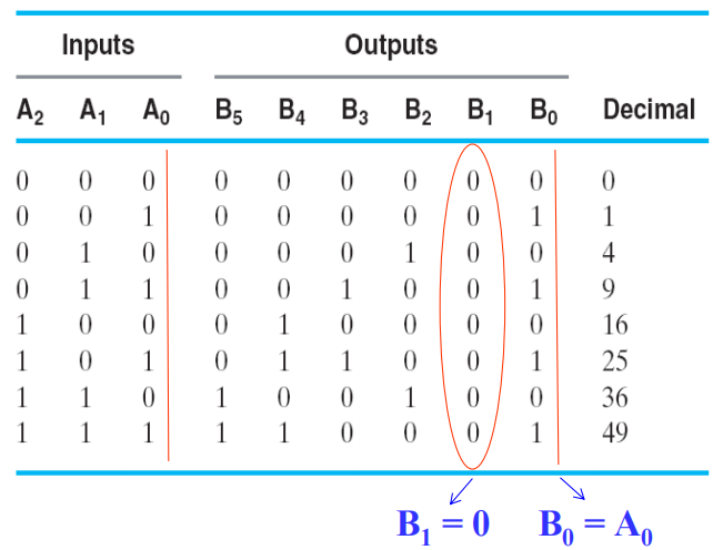 通过真值表分析 (\(B[5: 0] = A[2: 0] \times A[2: 0]\))