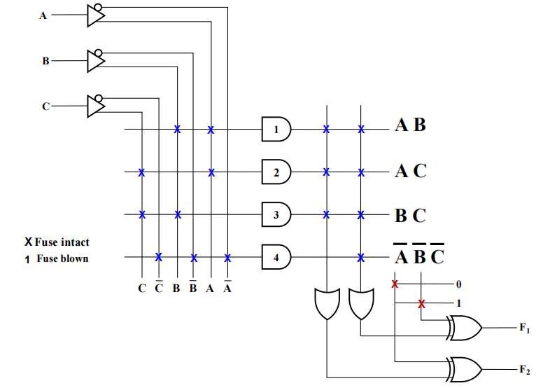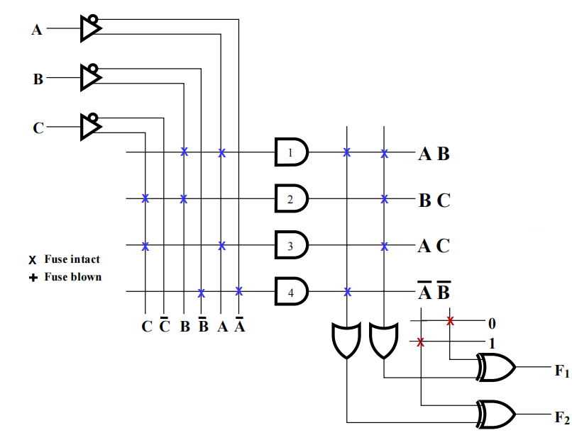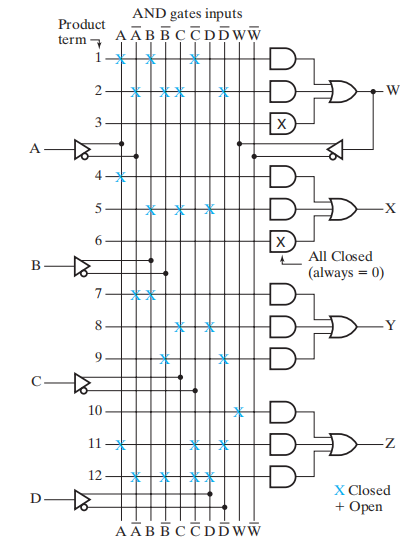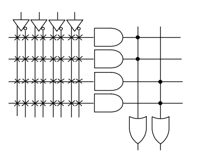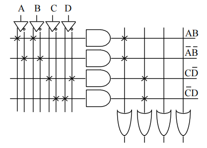 • 阵列中的 "\(\times\)" 表示最小项与或门的连接