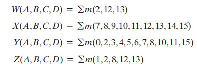 \[ \begin{align} W & = AB\overline{C} + \overline{AB}C\overline{D} \notag \\ X & = A + BCD \notag \\ Y & = \overline{A}B + CD + \overline{BD} \notag \\ Z & = AB\overline{C} + \overline{AB}C\overline{D} + A\overline{CD} + \overline{ABC}D \notag \\ & = W + A\overline{CD} + \overline{ABC}D \notag \end{align} \]