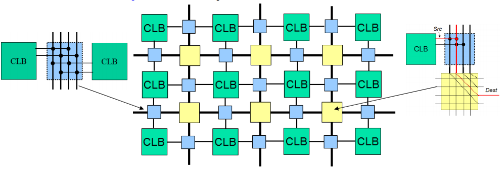 • 可编程开关箱 / 矩阵 (programmable switch box/matrix, SM),它允许 CLB 的输入和输出通过不同的线路相互连接