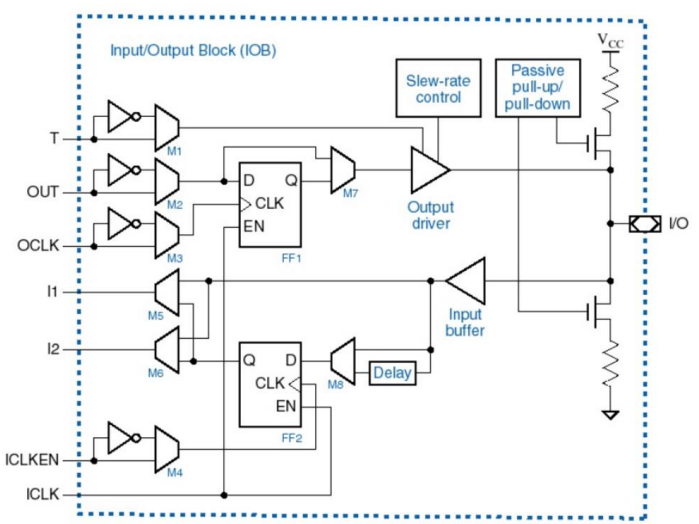 • 可编程输入输出模块 (programmable input outout module, IOB),它是在设备外围的特殊逻辑块,用于外部连接
