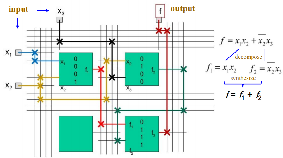 🌰: 用FPGA实现3变量函数\(f = x_1x_2 + \overline{x_2}x_3\),使用3个CLB(这里用到的是4-1 MUX)