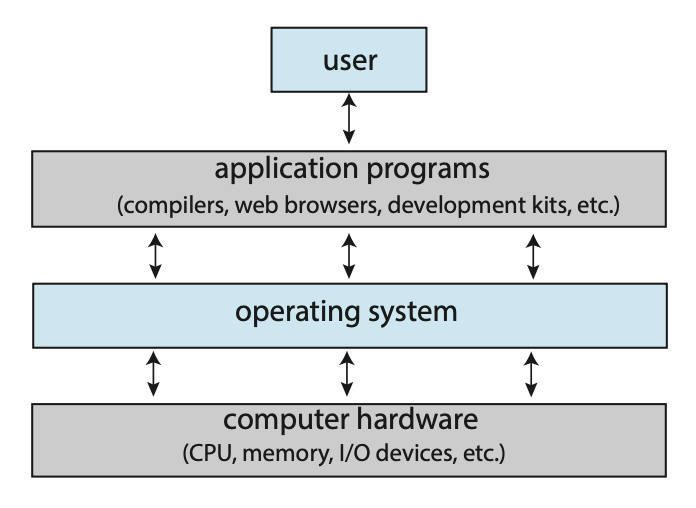 - 系统程序 (system programs) 和应用程序 (application programs):定义了硬件资源用于解决用户计算问题的方法,比如字处理器、电子表格、编译器、网页浏览器等