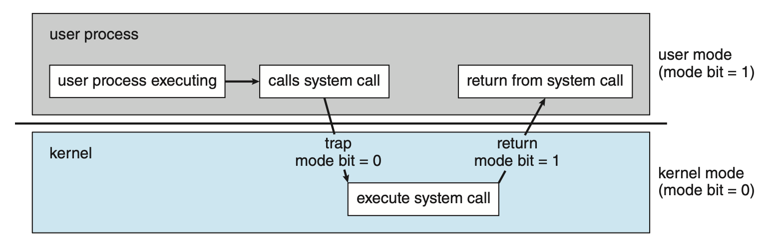 系统启动时,硬件以内核模式启动。随后,操作系统被加载,并在用户模式下启动用户应用程序。每当发生陷阱或中断时,硬件会从用户模式切换到内核模式(即,将模式位的状态更改为 0