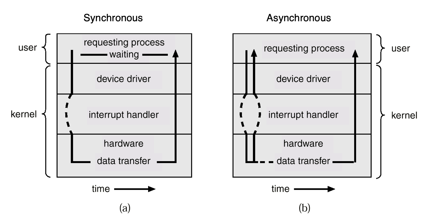 I/O 启动后,无需等待 I/O 完成就能将控制权返回给用户程序(异步(asynchronous))