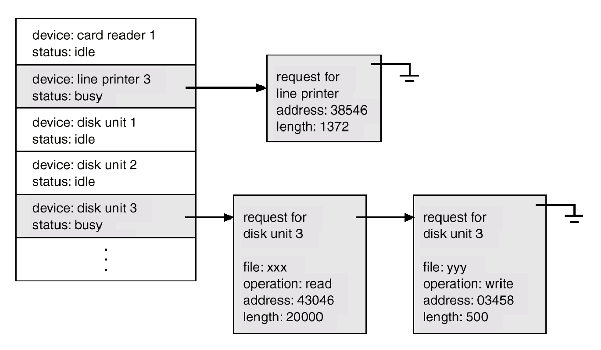 设备状态表(device-status table) 包含每个 I/O 设备的条目,指示其类型、地址和状态