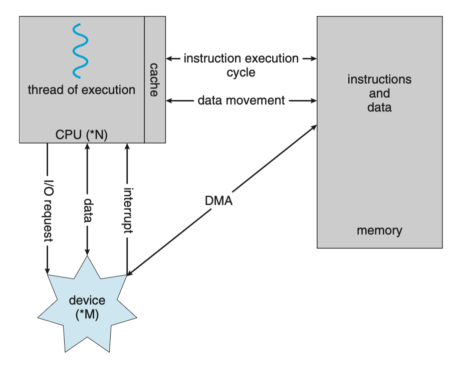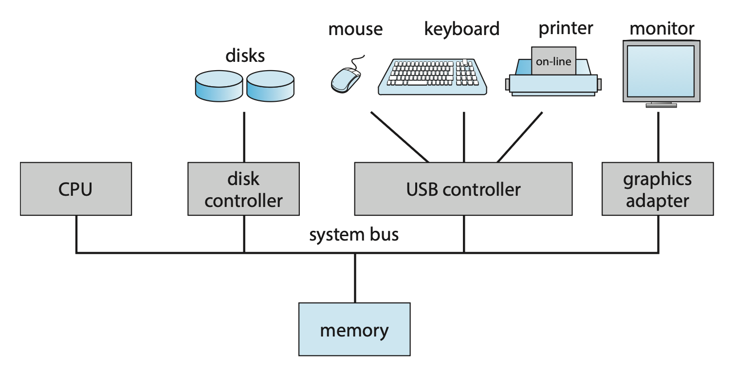 一个现代的通用目的计算机系统由一个或多个 CPU,以及一些通过公共总线(bus) 连接,并提供部件和共享内存访问的设备控制器(device controller)(有一个本地缓冲区 (local buffer))组成。