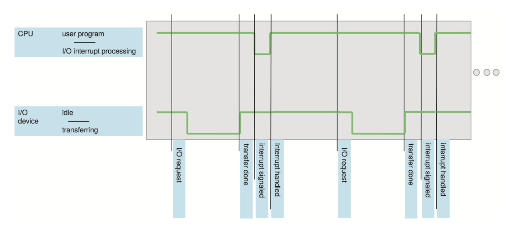I/O 启动后,仅在 I/O 完成时将控制权返回给用户程序(同步(synchronous))