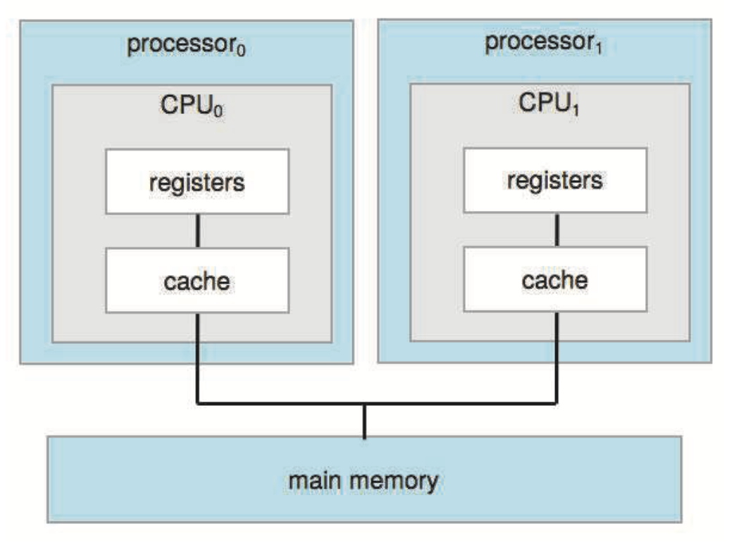 现在多处理器系统(multiprocessor systems) 支配了整个计算机领域。传统上来说,这样的系统包含两个及以上的处理器,每个处理器包含一个单核的 CPU。这些处理器共享计算机总线,有时还会共享时钟、内存和外围设备。这种系统的主要优势是增大了吞吐量 (throughput),即能在更短时间内完成更多工作。值得注意的是,N 个处理器并不能带来 N 倍的加速比,因为多个处理器共同完成一项任务时会有额外的开销。