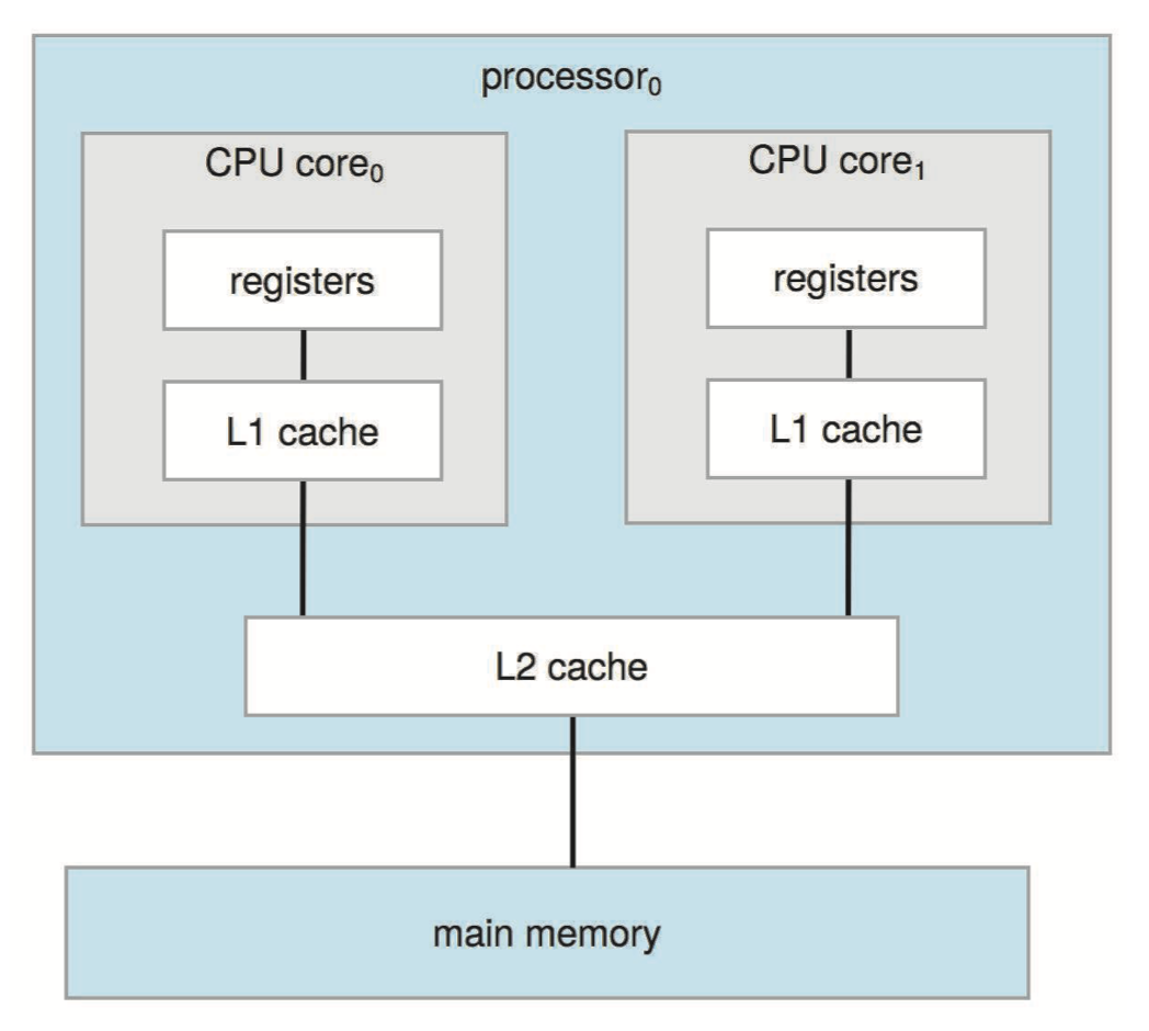 以前大多数计算机系统只有一个处理器,里面也只有一个单核的 CPU,其中的核心(core) 是执行指令,并用于本地存储数据的组件。核心除了能执行通用目的指令集外,还能执行一些特殊目的指令集,它们来自设备特定的处理器(指令集有限,不会运行进程