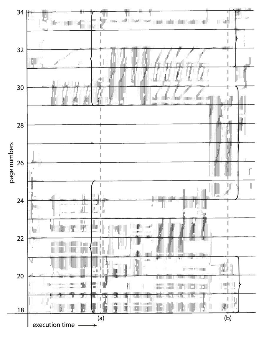 下图展示了某个进程的局部性随时间发生的变化(用花括号括起来的一组页就是一个局部性