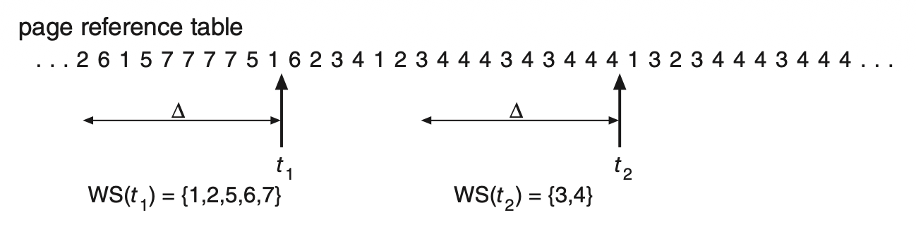 工作集模型(working-set model) 基于局部性的假设。我们用参数 \(\Delta\) 定义工作集窗口(working-set window)(的大小