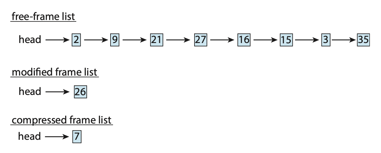 - 为解决页错误,OS 会维护一张空闲帧列表(free-frame list),存放所有空闲的帧(也会用在栈段和堆段的扩张中)