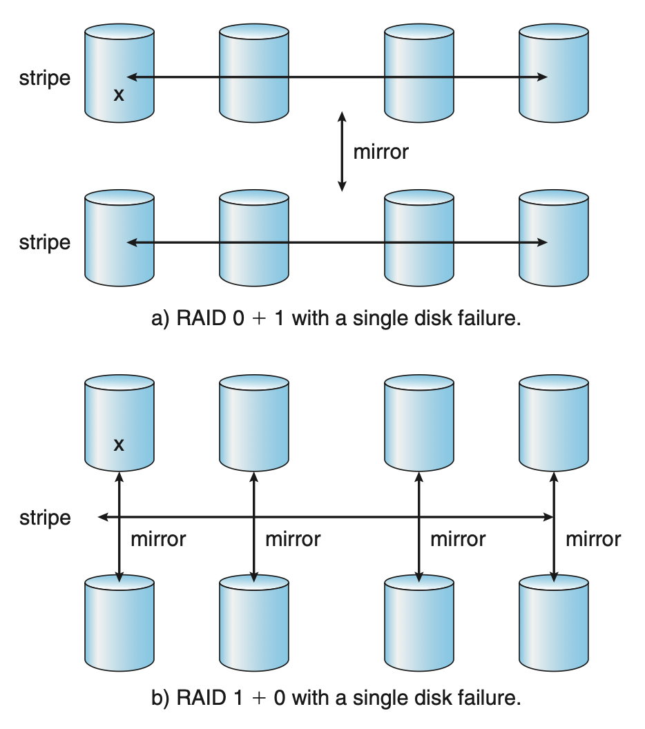 - 磁盘均被被条带化,随后所有条带都会被镜像到另一个等效的条带上