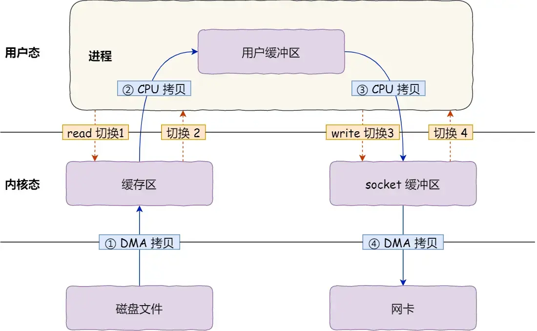 - 4 次数据拷贝(2 次 DMA 拷贝 + 2 次 CPU 拷贝)