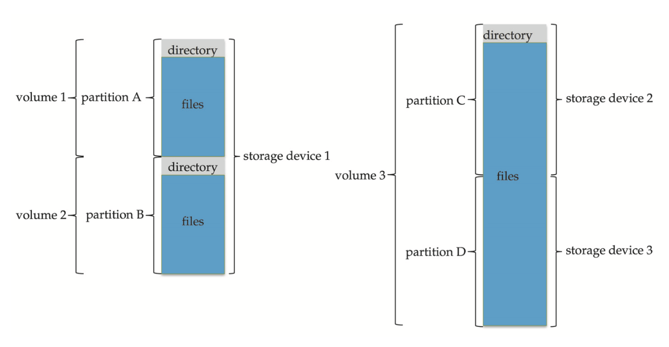 下图展示了一种典型的文件系统组织,包含了前面介绍过的存储设备 (storage device)、分区 (partition)、卷 (volume)、目录 (directory) 等概念: