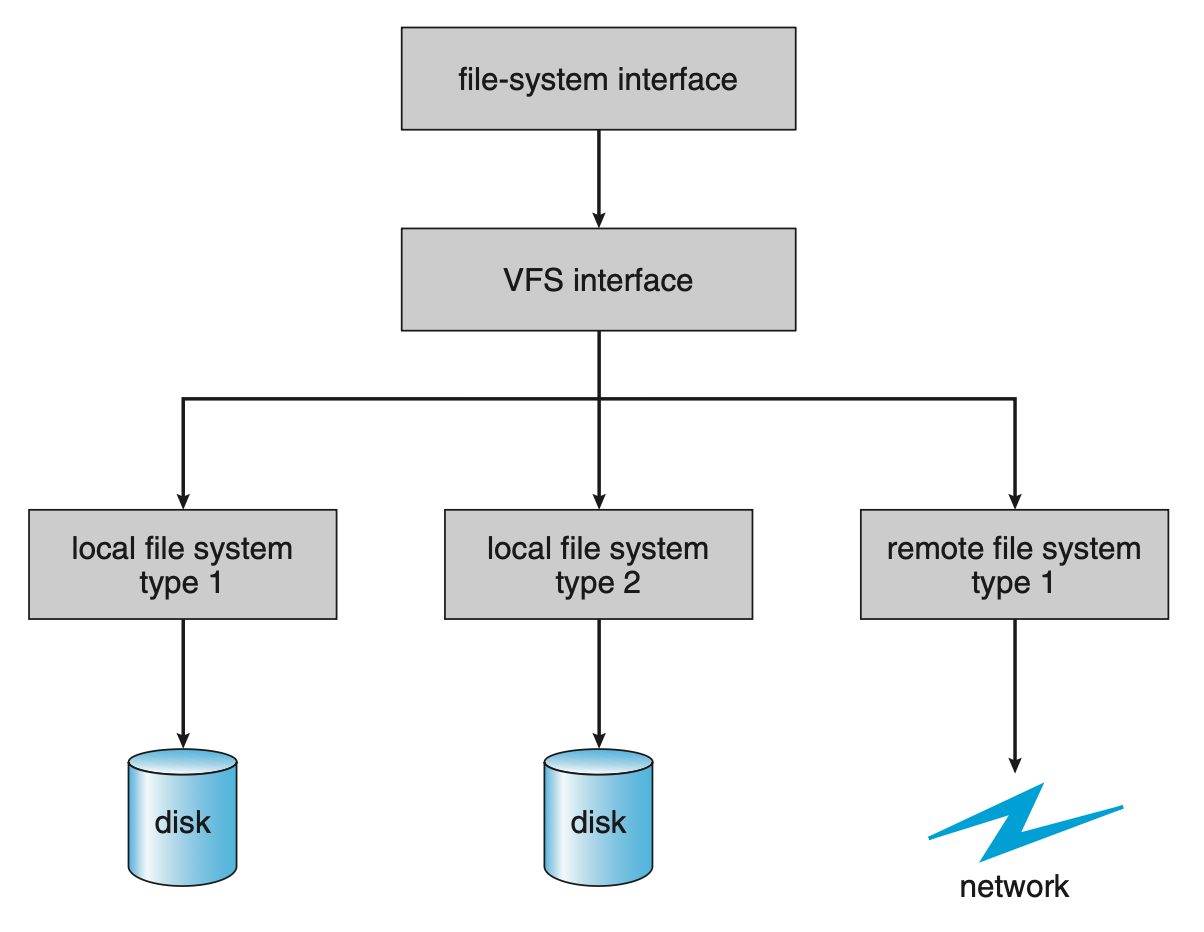 一种简单但并非最佳的实现多类型文件系统的方法是为每种类型编写目录和文件例程。然而,大多数 OS 使用面向对象的技术来简化、组织和模块化实现,这使得能在相同结构内实现非常不同的文件系统类型。