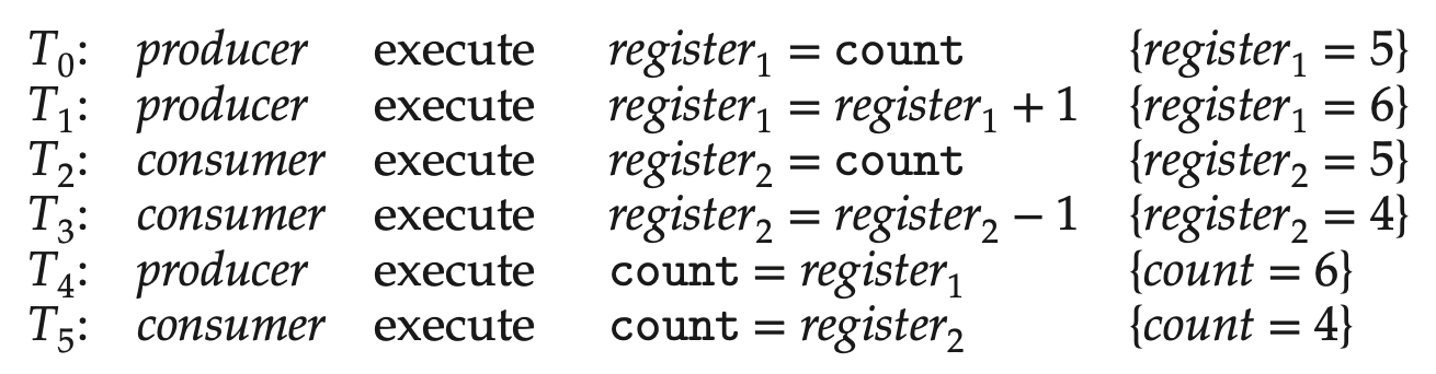 尽管单独看这两段代码没有问题,但是如果它们并发执行就不能正确运作了。假设当前 count = 5,且生产者和消费者分别并发执行 count++ 和 count--。在执行过程中,count 的值可能是 4,5 或 6。为理解这一问题,我们将这两条语句展开为机器指令: