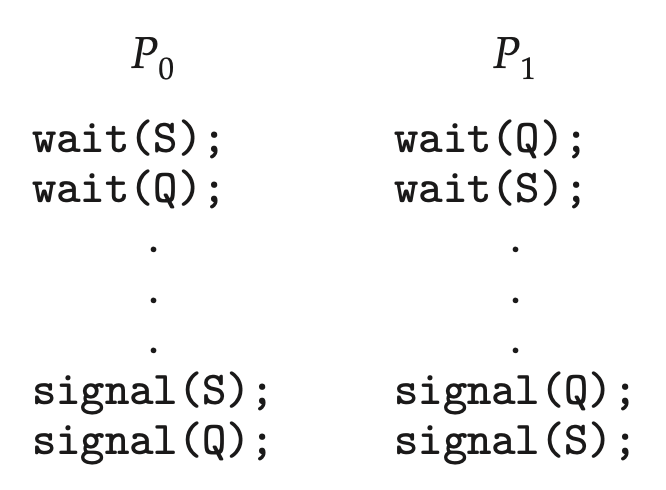 使用等待队列的信号量实现可能导致两个或多个进程无限期地等待一个只能由其中一个等待进程引发的事件(即 signal() 的执行