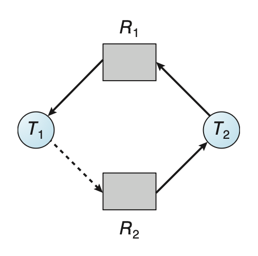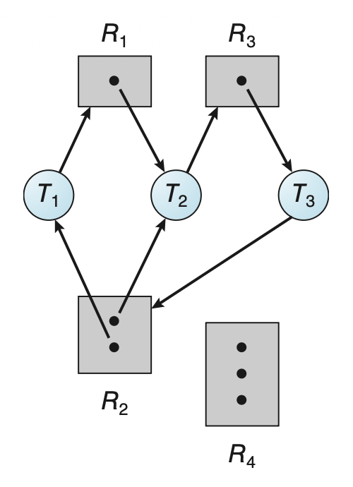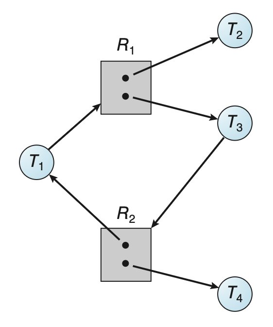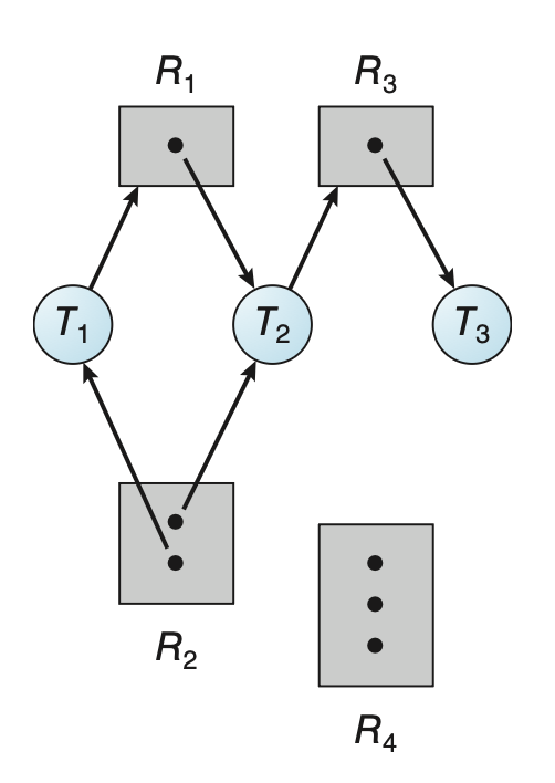 - 请求边(request edge) \(T_i \rightarrow R_j\):线程 \(T_i\) 正在请求 \(R_j\) 的一个实例,并且当前正在等待该资源