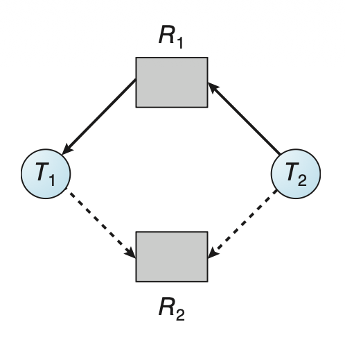 - 除了请求边和分配边外,还需额外引入一种声明边(claim edge) \(T_i \rightarrow R_j\),表示 \(T_i\) 可能在将来某个时间会请求资源 \(R_j\),在图中用虚线表示