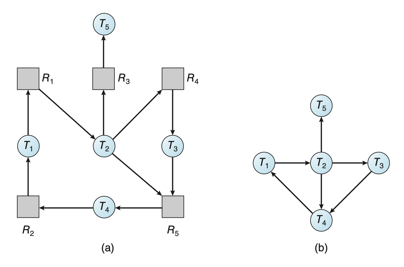 更准确地说,等待图中的边 \(T_i \rightarrow T_j\) 表明 \(T_i\) 等待 \(T_j\) 释放 \(T_i\) 所需的资源,即 \(T_i \rightarrow R_q, R_q \rightarrow T_j\)。如下图所示,右边的等待图就是从左边的资源分配图中得到的。