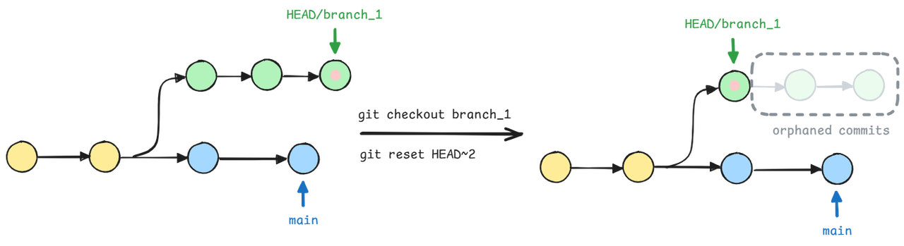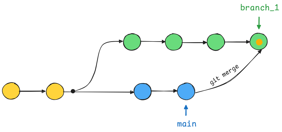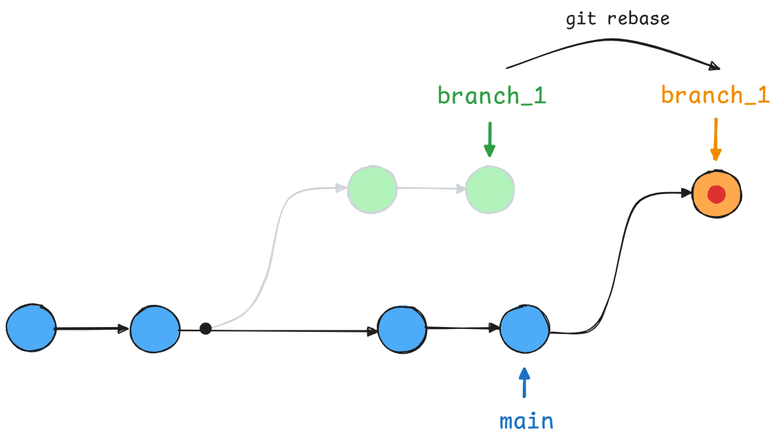 这里可以用到git rebase 变基命令,它的作用简单来说就是将分叉的本地历史提交记录整理成一条直线,看起来更加干净。下面将 branch_1 分支变基到 main 分支: