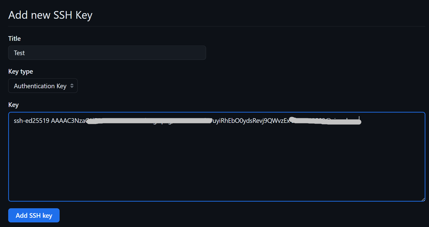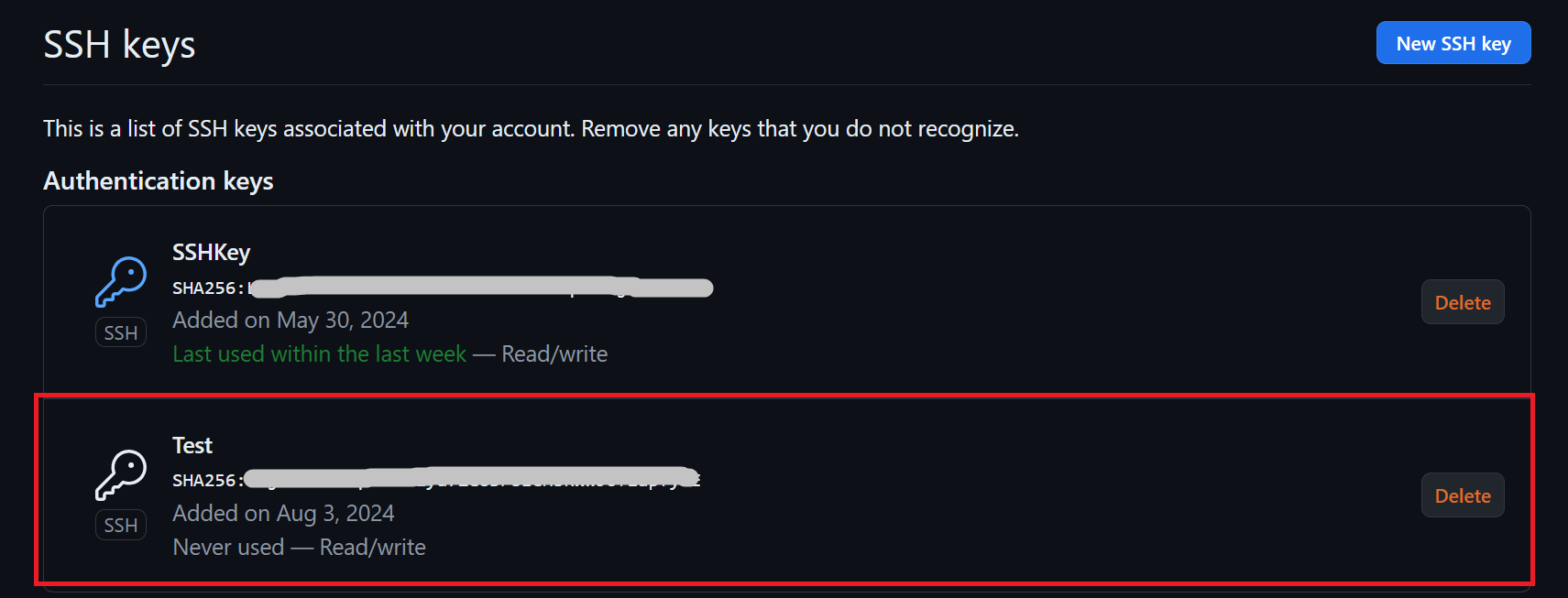 - 点击 Add SSH key 后完成创建,可以在 SSH keys 一栏查看结果
