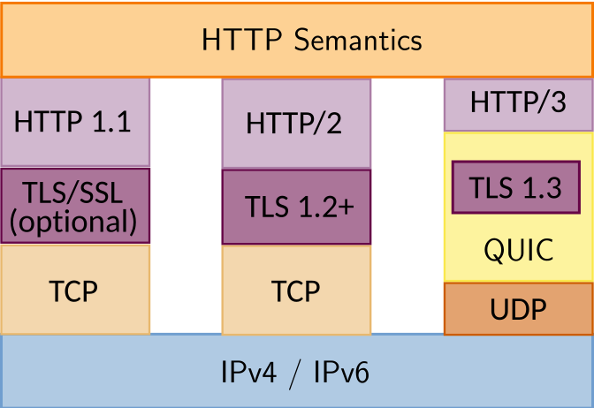 • HTTP/3 基于 QUIC 协议。QUIC 抛弃 TCP,建立在 UDP 之上,它通过其他手段克服 UDP 的不可靠性。